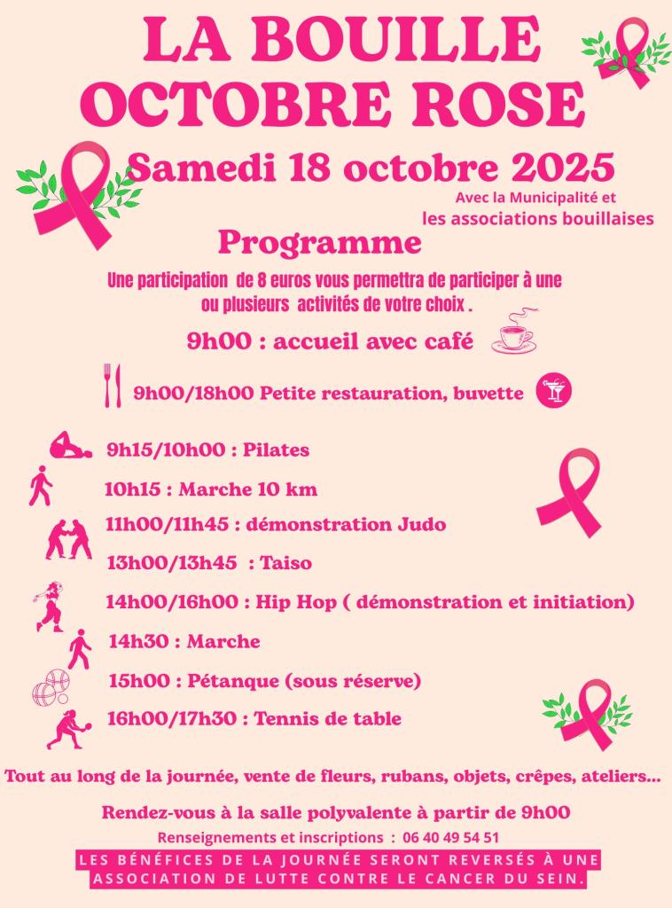 Octobre Rose à La Bouille Ecrit referent le lun 06/10/2025 - 12:53 Programme de la journée du 18 octobre 2025 En savoir plus sur Octobre Rose à La BouilleSe connecter pour publier des commentaires